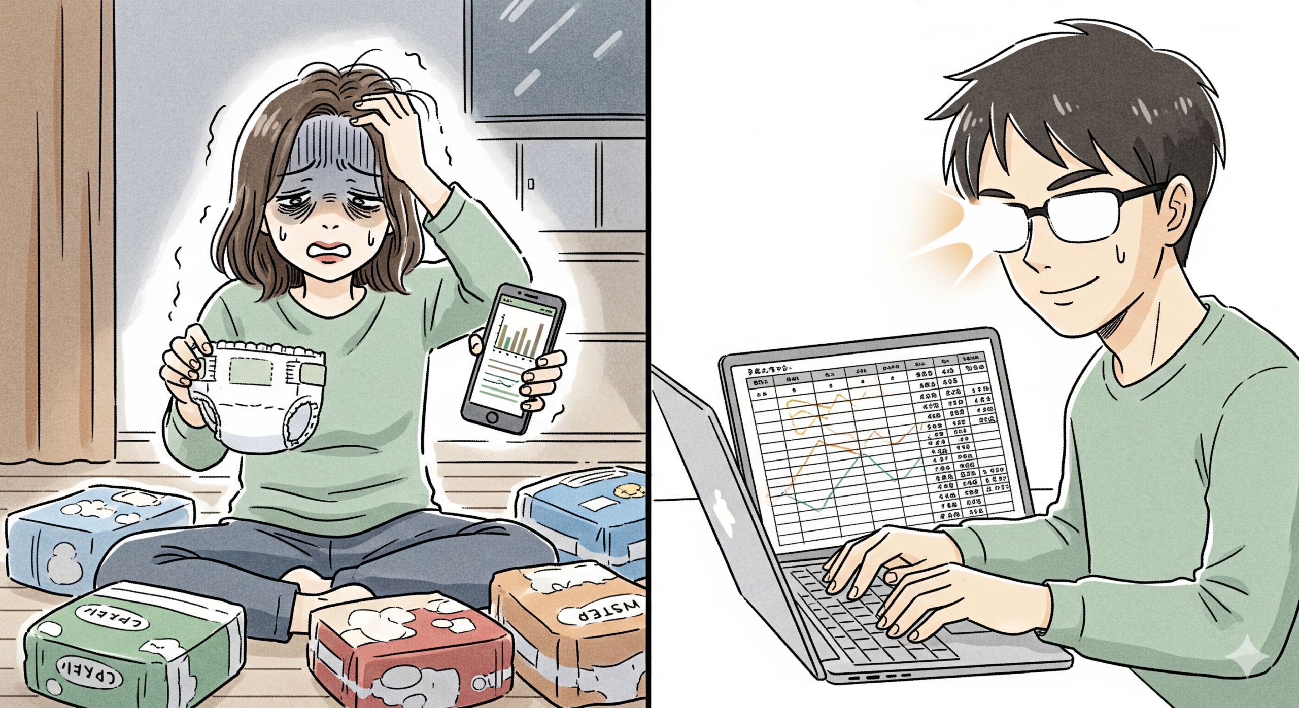 出ました。我が家の冷徹な効率厨。彼の手には、いつの間にか各社のおむつスペックが細かく入力されたスプレッドシートが握られていました。