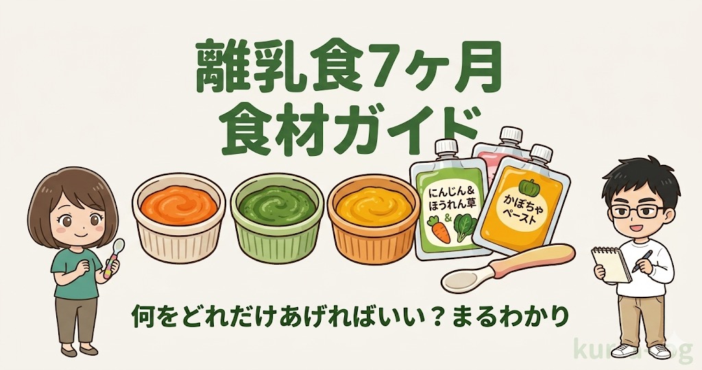 7ヶ月の食材追加は「1日1種類・午前中に・小さじ1から」が基本。不安ならbebeco(¥1,980)の野菜パウダーをおかゆに混ぜるだけから始めるのが一番ラク。味のバリエーションを増やしたいならmanma(¥1,550)のお試しセット。「手作りじゃなきゃ」と思い詰めないで。市販のベビーフードは栄養士監修の強い味方です。